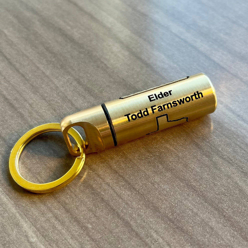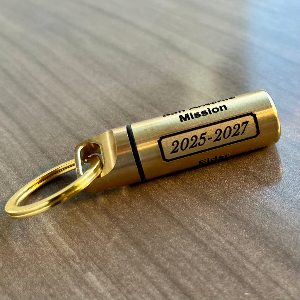 We custom engrave your Elders Name, Mission, Mission map and dates of service on a solid brass oil vial keychain. Perfect gift for the LDS Missionary.